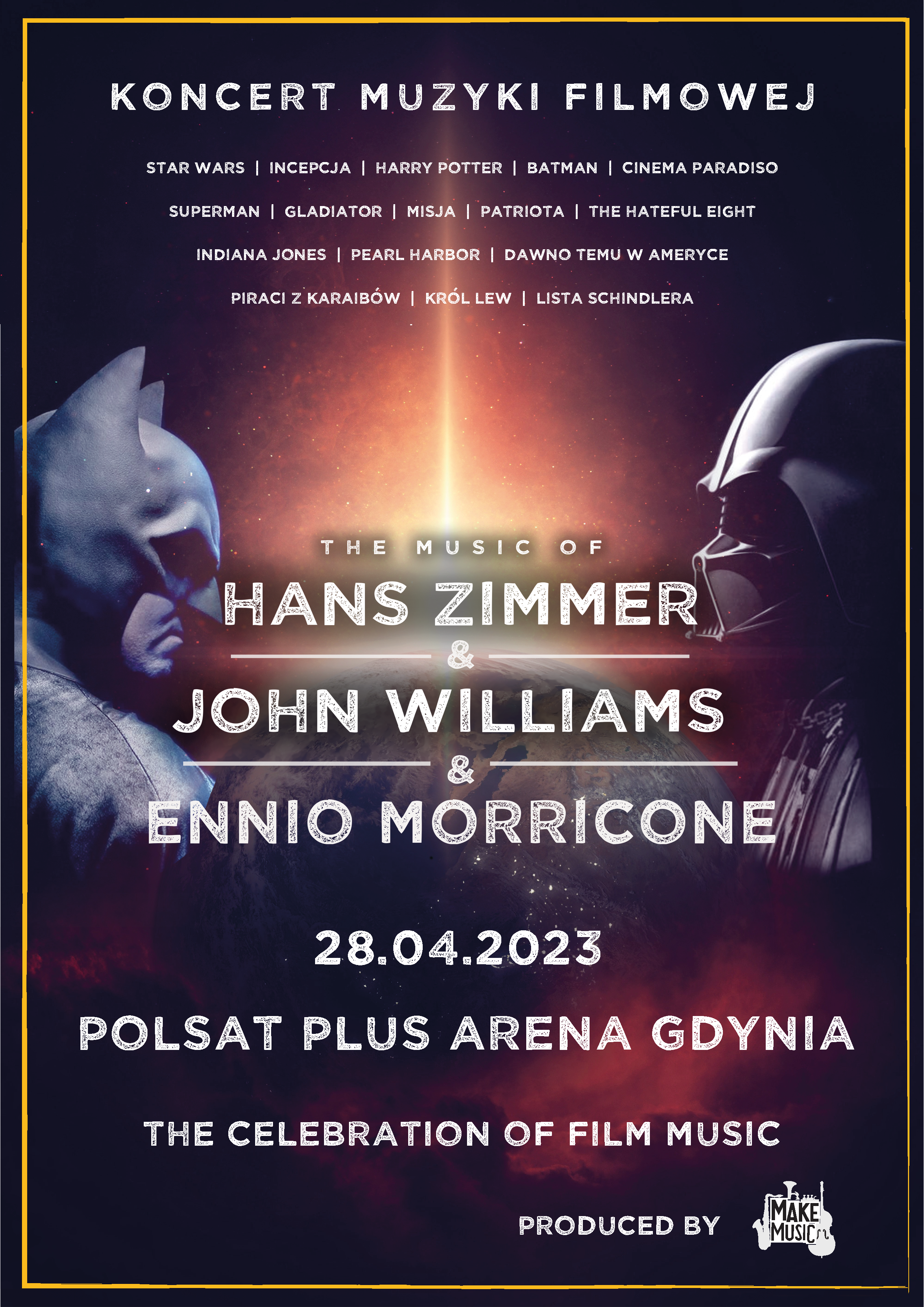 Wsłuchaj się w najbardziej znane utwory filmowe. Batman, Incepcja, Piraci z Karaibów i wiele innych. 28 kwietnia w Polsat Plus Arenie Gdynia odbędzie się Koncert Muzyki Filmowej – The music of Hans Zimmer & John Williams & Ennio.